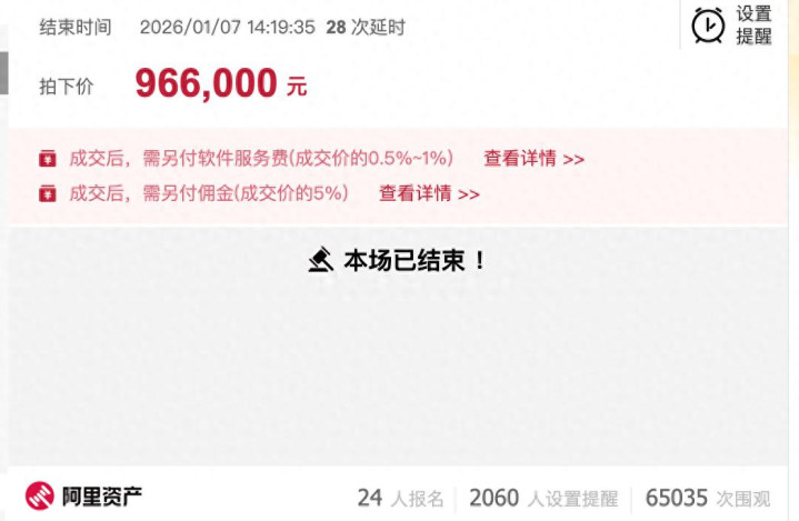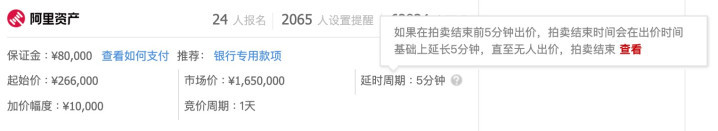 此次拍卖原定于1月7日14:00结束,但根据阿里资产拍卖平台“如果在拍卖结束前5分钟出价,结束时间会在出价时间基础上延长5分钟,直至无人出价,拍卖结束”的规则,当日13:55起,近20名竞买人展开密集出价,导致拍卖多次延时,最终于14:19:35正式收官。
